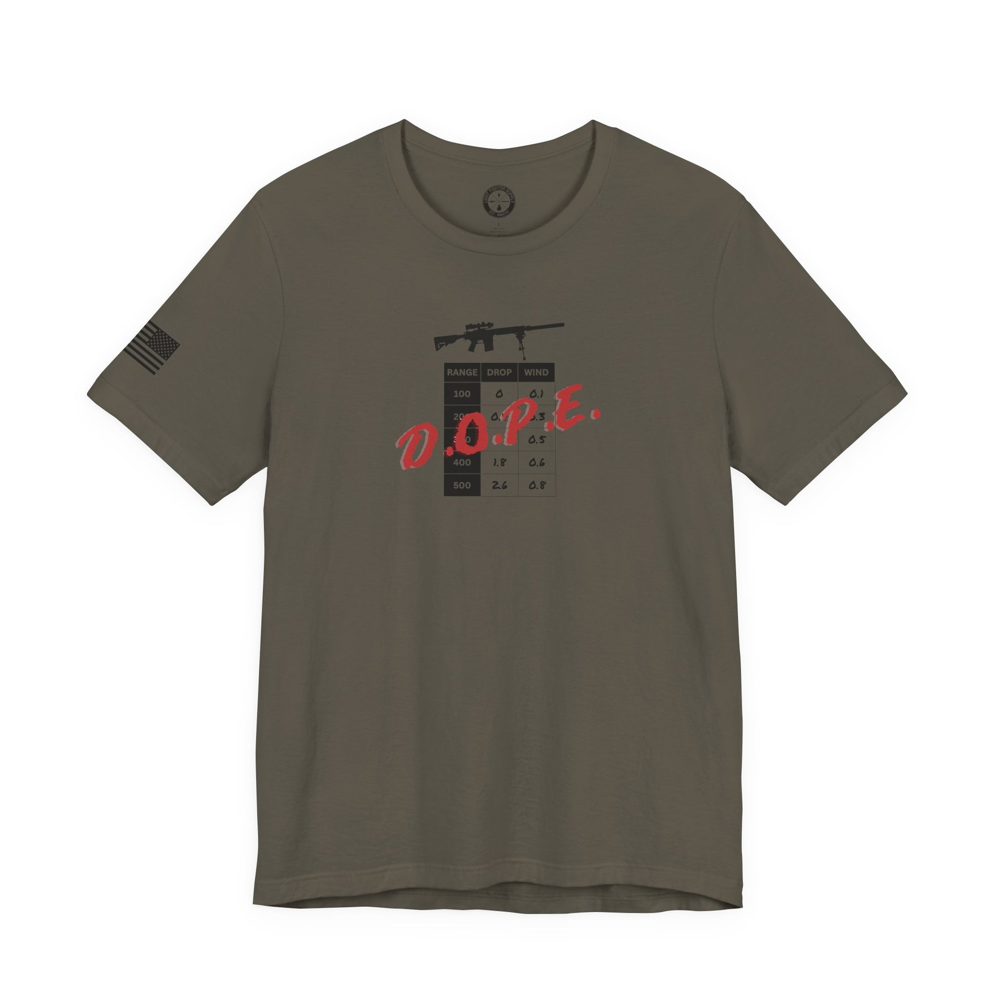 Design: D.O.P.E. stands for data on previous engagement. Precision shooters log this data in a D.O.P.E. book, app, or range card to predict and dial precise corrections for future shots at similar distances/environments, reducing trial-and-error and enabling first-round hits. D.O.P.E typically records range-to-target, wind speed, point of aim vs. point of impact, and ammunition specifics. Anyone who has been a sniper or marksman will be the most familiar with this term. This shirt is a tribute to them.